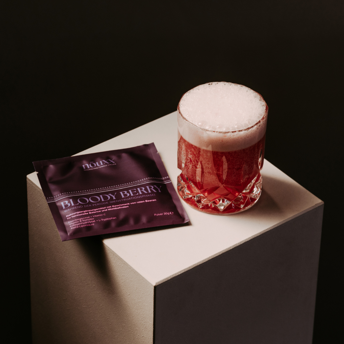 Vermische 1 Sachet (30 g) BLOODY BERRY mit 300 ml kaltem Wasser. Täglich während der Menstruation (Tag 1-5 deines Zyklus) als Teil der nōuxx Menstrual Cycle Routine konsumieren.