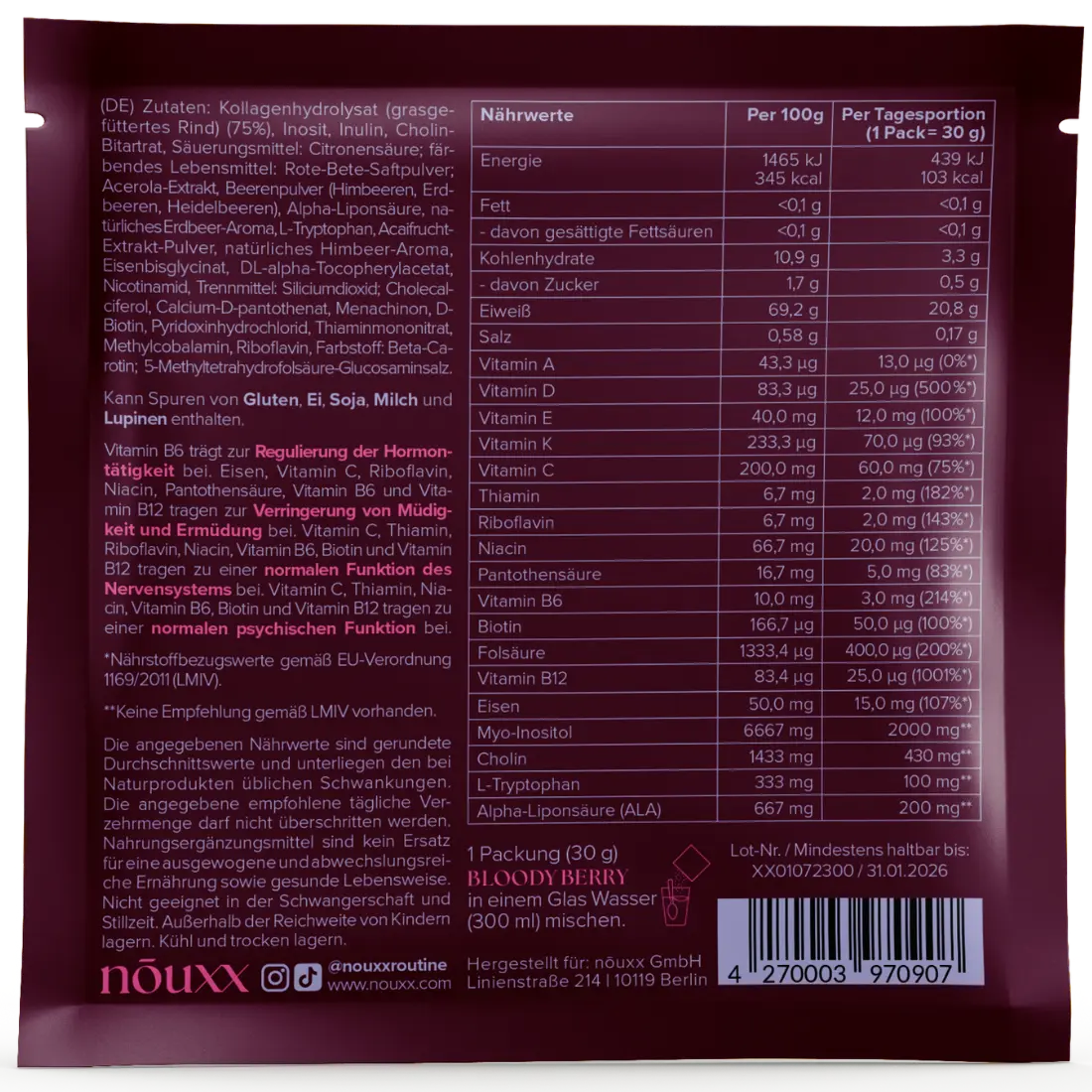 Kollagenhydrolysat (Rind) (75%), Inosit, Inulin, Cholin-Bitartrat, Säuerungsmittel: Citronensäure; färbendes Lebensmittel: Rote-Bete-Saftpulver; Acerola-Extrakt, Beerenpulver (Himbeeren, Erdbeeren, Heidelbeeren), Alpha-Liponsäure, natürliches Erdbeer-Aroma, L-Tryptophan, Acaifrucht-Extrakt-Pulver, natürliches Himbeer-Aroma, Eisenbisglycinat, DL-alpha-Tocopherylacetat, Nicotinamid, Trennmittel: Siliciumdioxid; Cholecalciferol, Calcium-D-pantothenat, Menachinon, D-Biotin, Pyridoxinhydrochlorid, Thiaminmononitrat, Methylcobalamin, Riboflavin, Farbstoff: Beta-Carotin; 5-Methyltetrahydrofolsäure-Glucosaminsalz.