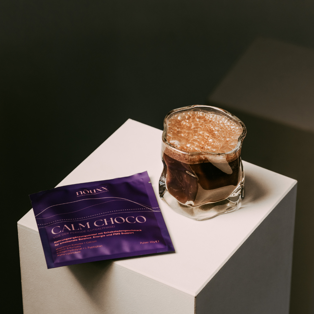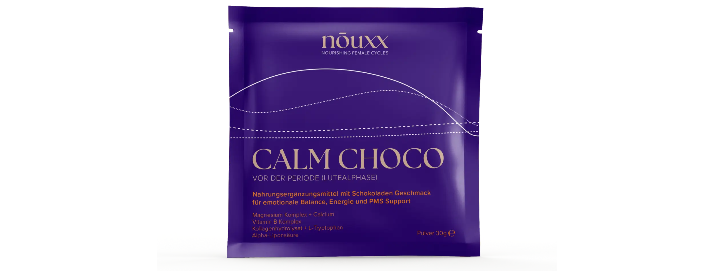 Vermische 1 Sachet (30 g) CALM CHOCO mit 300 ml kaltem Wasser. Täglich während der lutealen Phase (nach dem Eisprung und vor der Menstruation, Tag 16-30 deines Zyklus) als Teil der nōuxx Menstrual Cycle Routine konsumieren.