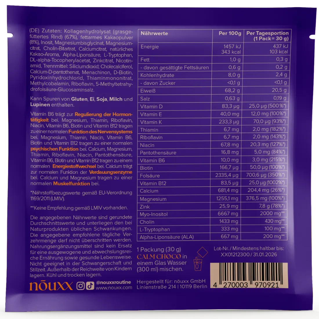 Kollagenhydrolysat (Rind) (67%), fettarmes Kakaopulver (8%), Inosit, Magnesiumbisglycinat, Magnesiumcitrat, Cholin-Bitartrat, Calciumcitrat, natürliches Kakao-Aroma, Alpha-Liponsäure, L-Tryptophan, DL-alpha-Tocopherylacetat, Zinkcitrat, Nicotinamid, Trennmittel: Siliciumdioxid; Cholecalciferol, Calcium-D- pantothenat, Menachinon, D-Biotin, Pyridoxinhydrochlorid, Thiaminmononitrat, Methylcobalamin, Riboflavin, 5-Methyltetrahydrofolsäure-Glucosaminsalz.