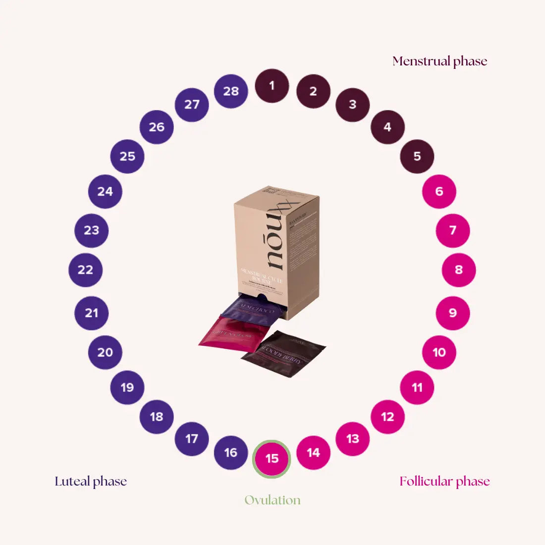 Der durchschnittliche Menstruationszyklus dauert etwa 28 Tage und besteht aus vier Phasen. Unsere Menstrual Cycle Routine ist darauf abgestimmt, den natürlichen Rhythmus deines Körpers zu ergänzen und ihn in jeder Phase mit wichtigen Nährstoffen zu versorgen.